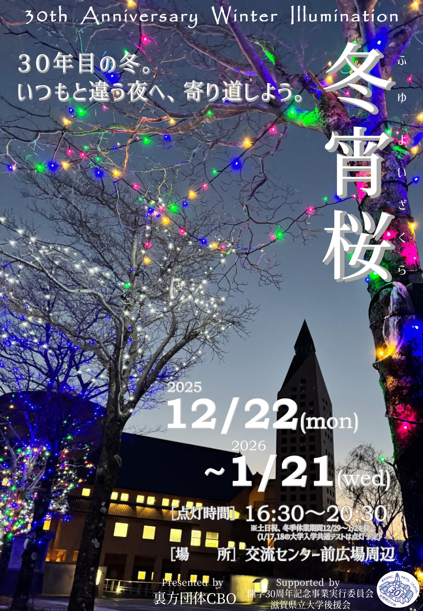 滋賀県立大学では、開学30周年記念事業の一環として、2025年12月22日(月)より、キャンパス内を彩るイルミネーション企画「冬宵桜(ふゆよいざくら)~30th Anniversary Winter Illumination~」を開催いたします。本企画は、後援会が活動を助成をしている裏方団体CBOが企画・運営を行っているもので、2019年の開始以来、学生を始め教職員にも親しまれる冬の風物詩となっています。