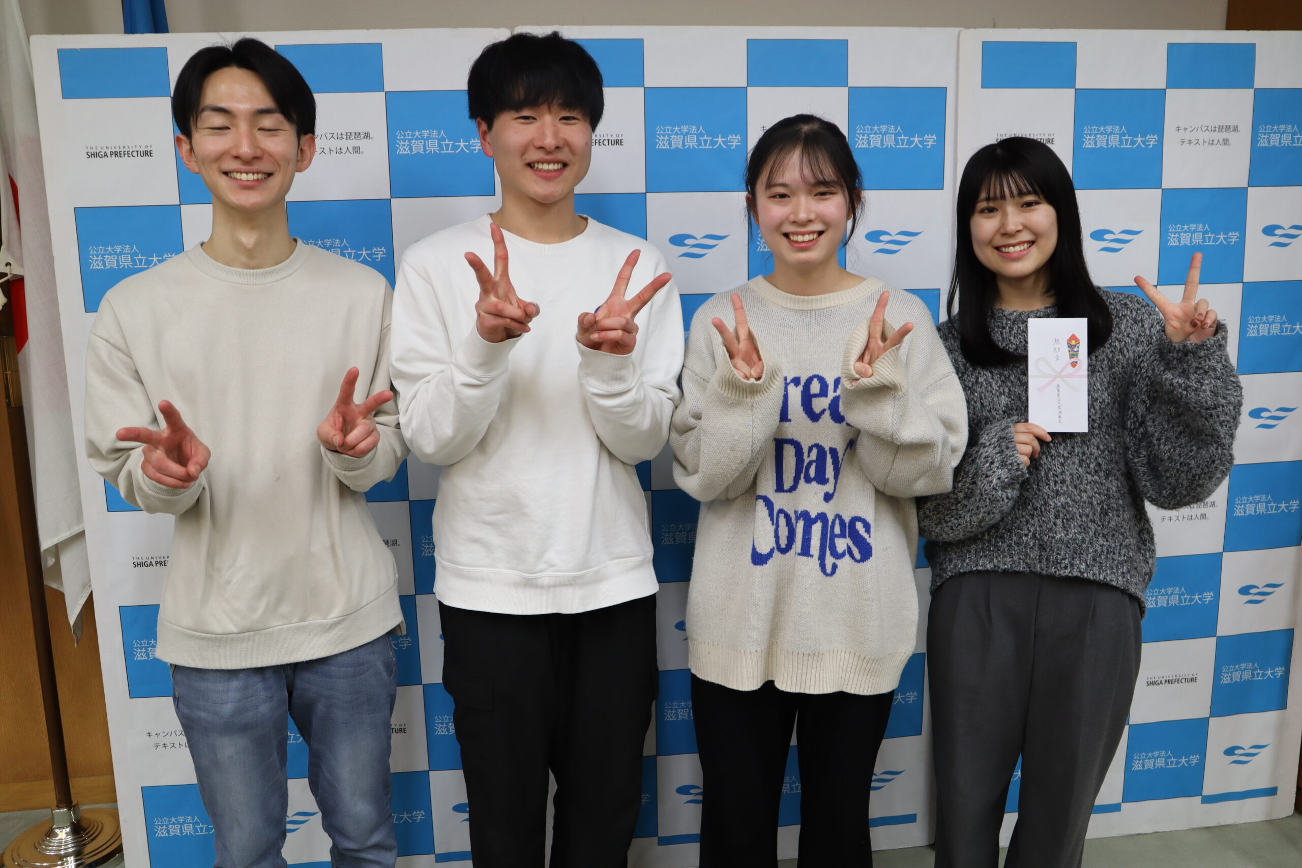 滋賀県立大学後援会では、全国大会や近畿大会等に予選を経て出場する学生に「大会出場激励金」を授与しています。今回は、森下教育・学生支援担当理事より吹奏楽部のサクソフォーン四重奏の4名に激励金をお渡ししました。